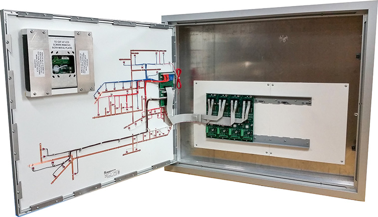 The GEO-3000 series of active graphic products is specifically designed for normal use applications. The GEO-3000 Series features an attractive and extremely durable clear anodized aluminum frame and a 1/8î clear Lexan protective lens. The buildingís layout and zones are defined by a black outline on a white background with all egress corridors indicated in a distinctive black hatch pattern. As an option zone boundaries can be enhanced using zone separations in pastel inks. The graphic itself is printed in a UV protected ink on a film overlay which can be easily replaced if the building or zone layouts change over time. Mounting of customer supplied LCD displays, microphones and control panels is available. Graphics are available in either outer or inner door configurations. Available in flush, surface or shallow surface back-box mounting configurations. Alternatively the graphic can be mounted in a customer supplied enclosure.